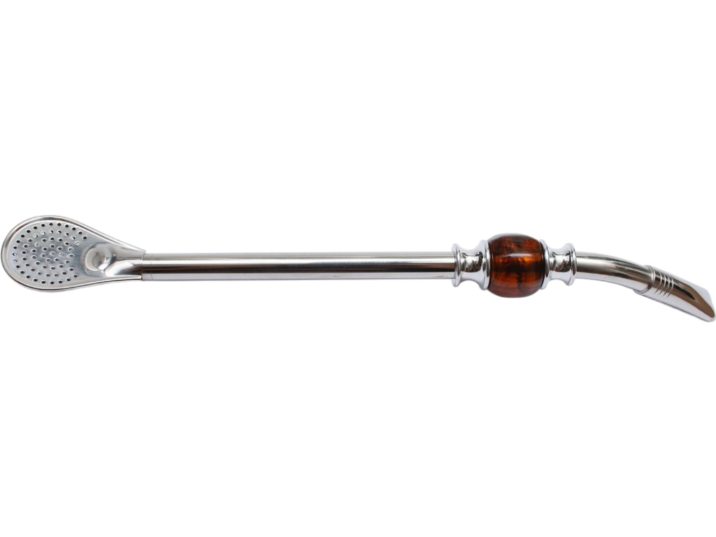 Bombilla vyrobená z nehrdzavejúcej ocele s dvoma chladiacimi krúžkami a hnedým kameňom.