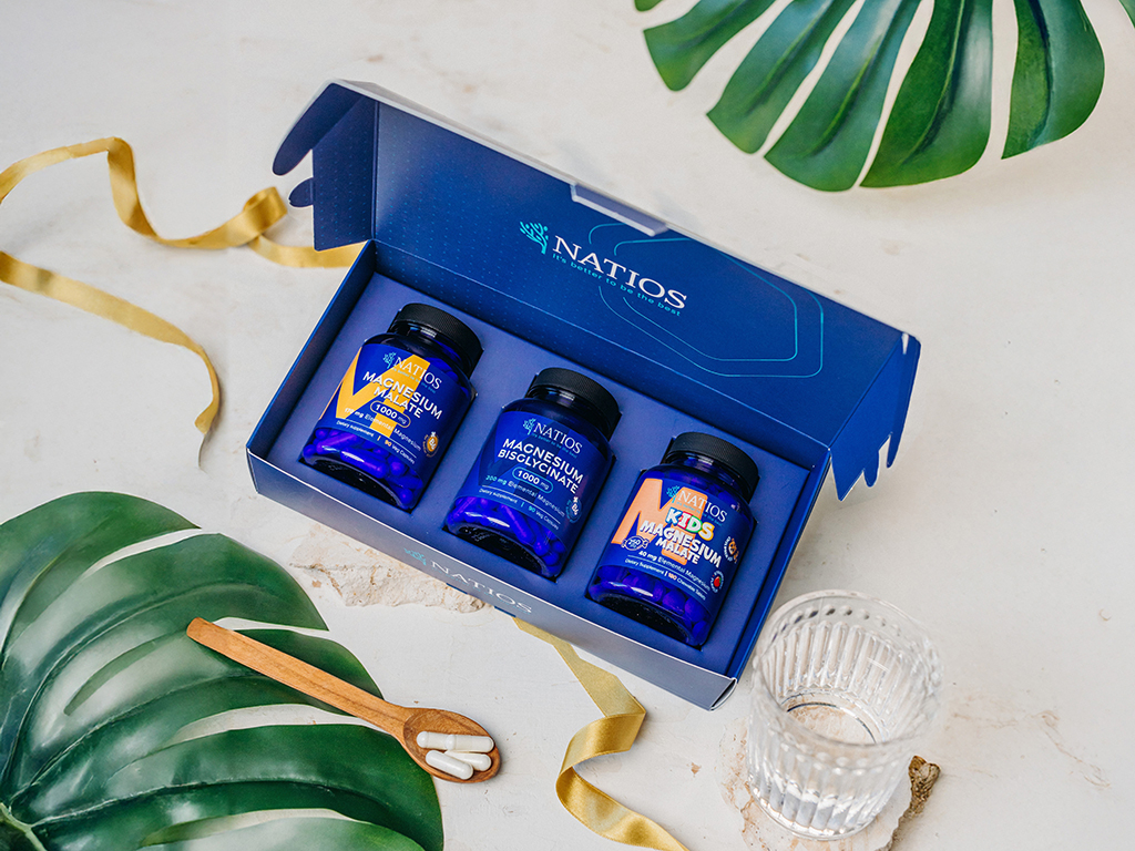 NATIOS Darčekový balíček Horčíky pre celú rodinu Horčík Malát, Horčík Bisglycinát, Kids Horčík Malát