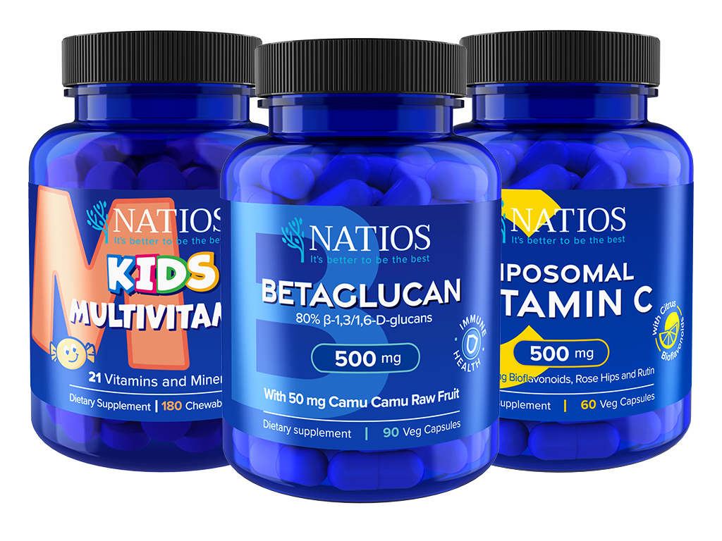 NATIOS Výhodný balíček Imunita pre celú rodinu Vitamín C, Kids Multivitamín, Betaglucan