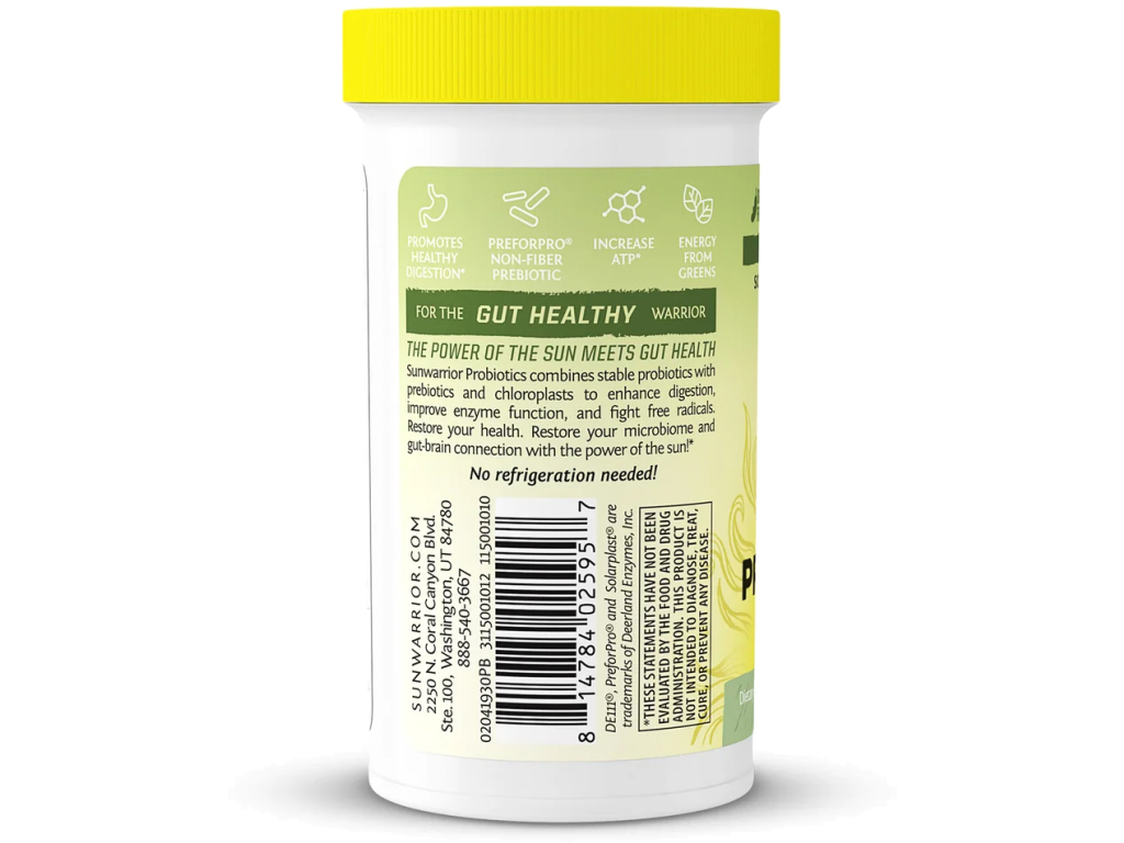 Sunwarrior Probiotics kombinuje 10 miliárd CFU probiotík s 15 mg prebiotickej zmesi fágov bez vlákniny a extraktom zo špenátu. Vďaka obsahu prebiotických bakteriofágov, ktoré vytvárajú priaznivé prostredie pre probiotické bakteriálne kmene, sa zvyšuje účinnosť probiotík a ich efektívna hodnota v črevách dosahuje až 100 miliárd CFU.